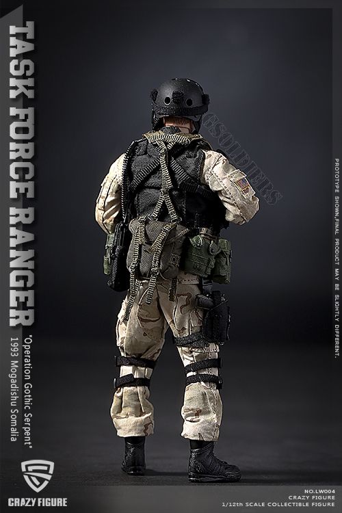 Подвижная коллекционная фигурка солдата 75-го полка рейнджеров Армии США из фильма "Падение Черного Ястреба" в масштабе 1/12 - это точная реплика персонажа, выполненная с высокой степенью детализации. Фигурка имеет подвижные суставы, что позволяет создавать различные позы и демонстрировать динамичные боевые сцены.